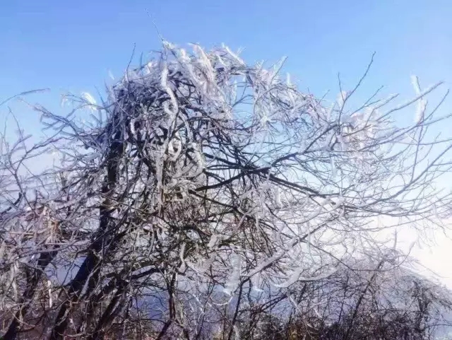 當太陽冉冉升起,老樂山云頂的霧氣便會逐漸地消散,晴空萬里,霧凇綻放開迷人的風姿,把老樂山裝點得潔白透亮,千姿百態(tài)的霧凇給人們留下一段美好難忘的時光。