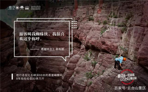 ▲云臺(tái)山“蜘蛛俠”環(huán)衛(wèi)工郭有順在清理垃圾