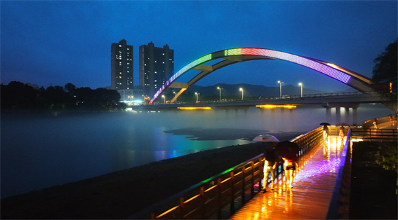 夜晚,步行橋面的燈光映襯平流霧,如夢(mèng)如幻。 歐陽(yáng)國(guó)威 攝