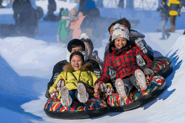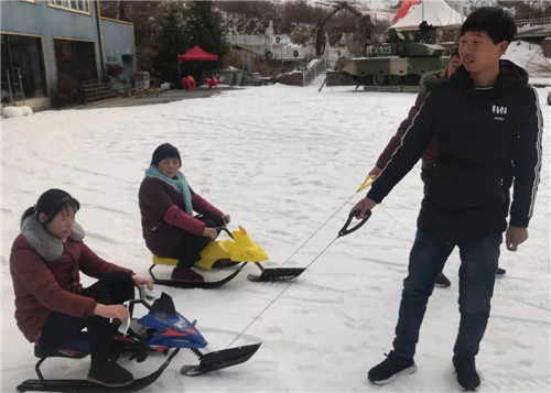 比賽一:親子雪地滑車比賽(兩人一組一位家長和孩子,共10組,家長坐在雪地滑車上由孩子在前面拉著前行最先到達終點站者獲勝。)