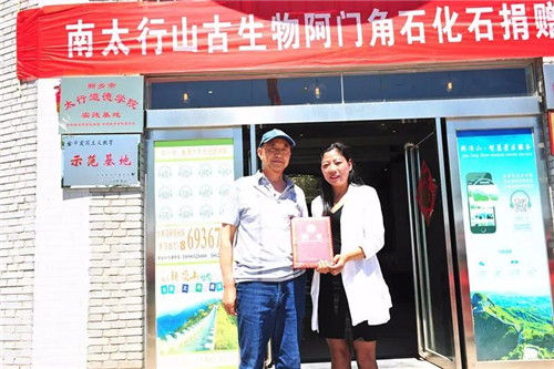 侯玉保同志老家是在輝縣市后莊村。據(jù)悉,阿門角石化石是在輝縣市愚公洞旁的山上發(fā)現(xiàn)的,珍藏有好多年了。此次捐贈他表示,隨著現(xiàn)在越來越熱的研學(xué)游,捐贈阿門角石到轎頂山地質(zhì)博物館是給前來參觀的青少年提供更多的樣品和更全面更多的學(xué)習(xí)機會,自己也為能給科普事業(yè)盡一份微薄之力感到非常高興。