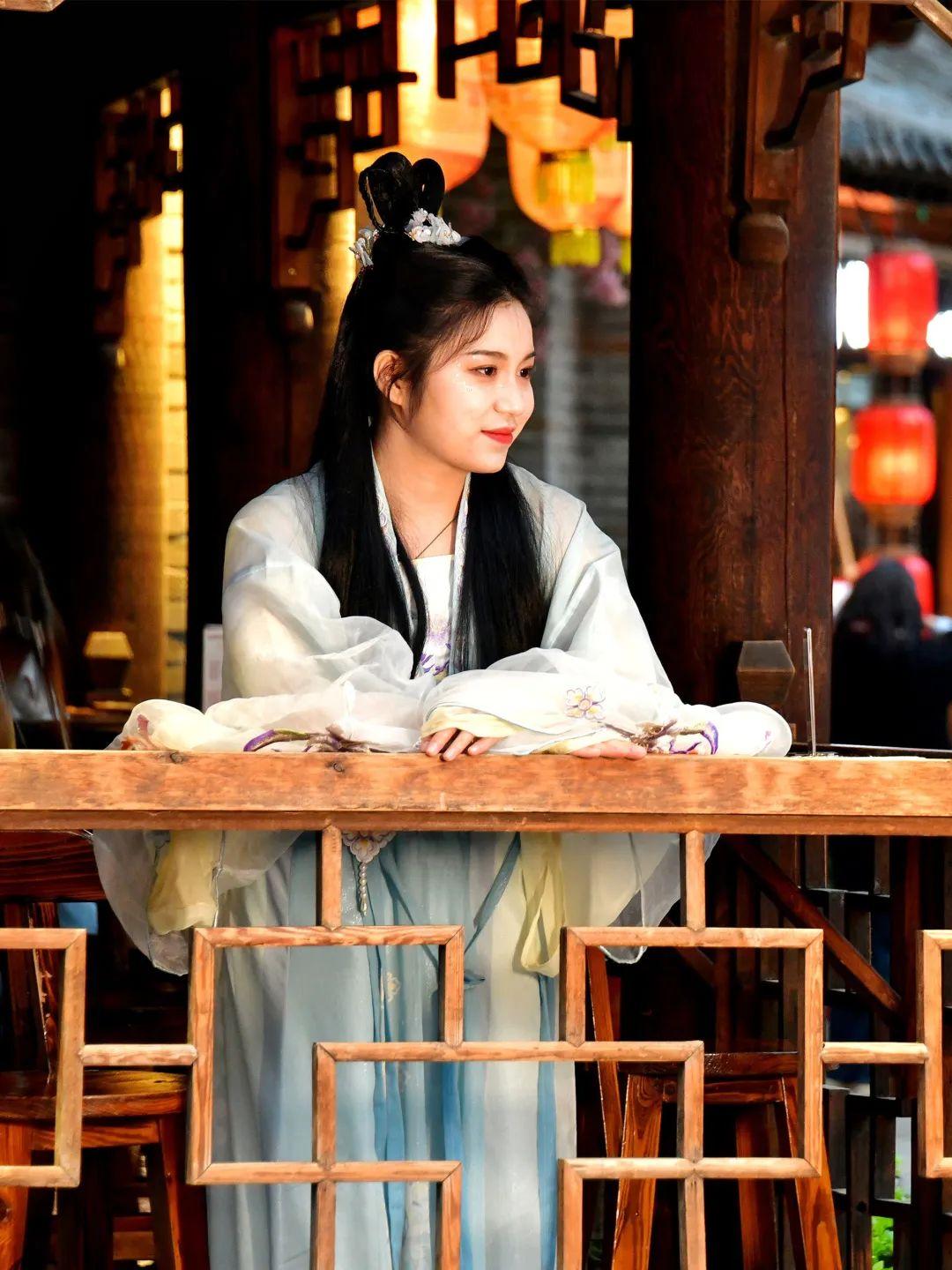 新潭兩岸,煙火繁華,是攝影師們最愛的聚集地,也是不少漂亮漢服小姐姐們的街拍首選。白日錦鯉搖曳,五彩斑斕;傍晚日暮水色,晚舟如畫;夜晚燈火璀璨,殿閣浮光。