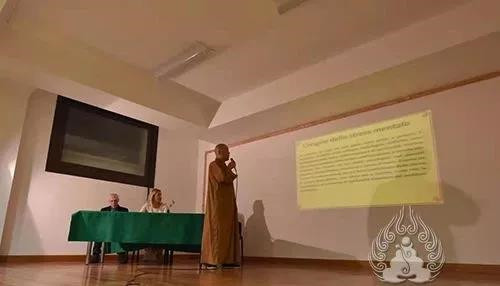 講座開始前,意大利少林拳法聯(lián)盟副主席Marco De Leo向大家介紹了協(xié)會宗旨及本次講座概要。隨后,釋延輝向大家介紹了少林禪、武、醫(yī)文化對于身心健康方面的重要指導,以及少林寺方丈釋永信法師提倡“功夫禪”的核心要義,得到在座聽眾的認可與稱贊。