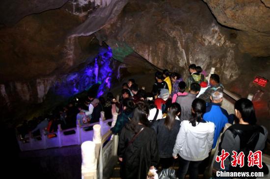 游客中溶洞內(nèi)緩慢前行。(王中舉 攝)