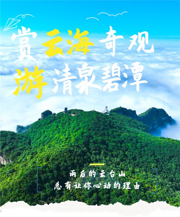 連綿的夏雨過后,云臺(tái)山被“海”包圍了!云海頻現(xiàn),飛瀑流泉,蔚為壯觀,乘索道飛云而上,穿密林聽泉觀瀑,來云臺(tái)山開啟一場(chǎng)奇妙之旅。
