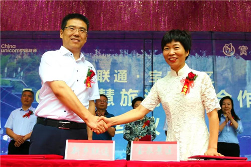 中國聯(lián)通新鄉(xiāng)聯(lián)通分公司總經(jīng)理王曉明和春江集團(tuán)、寶泉股份董事長張洪梅共同簽訂新鄉(xiāng)聯(lián)通與寶泉景區(qū)5G+智慧旅游戰(zhàn)略合作協(xié)議