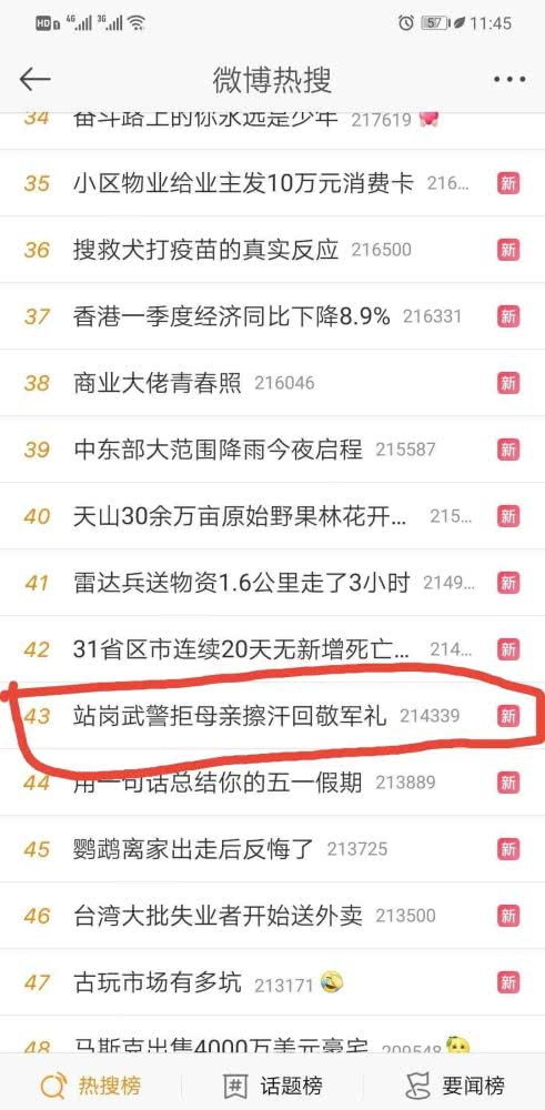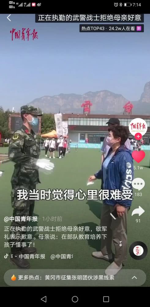 話題#正在執(zhí)勤的武警戰(zhàn)士拒絕母親好意登上抖音熱點(diǎn)榜,短時間內(nèi)獲得243.3W抖音用戶關(guān)注。
