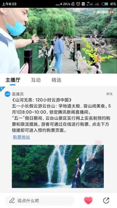 5月1日上午8:00,云臺山聯(lián)合騰訊開展120分鐘的“山河無恙 云游云臺山”直播活動,帶廣大網(wǎng)友線上云游云臺山初夏好風(fēng)光。