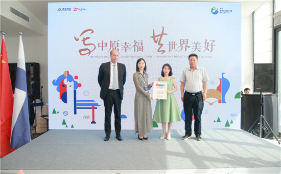 接下來,芬蘭駐華大使肅海嵐、中芬創(chuàng)新美好生活方式研究協(xié)會(huì)秘書長(zhǎng)陸斐、建業(yè)地產(chǎn)助理總裁兼足球小鎮(zhèn)項(xiàng)目總經(jīng)理劉堉共同完成建業(yè)中原文化小鎮(zhèn)之櫻桃溝足球小鎮(zhèn)《中芬創(chuàng)新美好生活方式研究協(xié)會(huì)官方研究基地》授牌儀式。