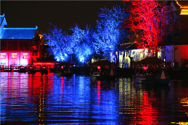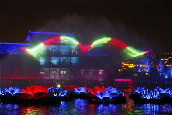 東京夢華在人間 眼前荷花星星點點,猛然一股噴泉沖向天際。遠處,一縷縷激光射向瑰瑋的建筑,照射出大宋國都的氣宇軒昂,展現(xiàn)出千年前汴梁東京的繁華市井,如夢如幻、恍如隔世。