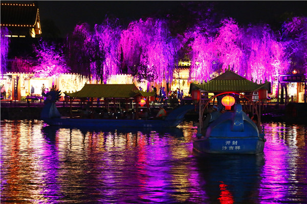 隋堤煙柳今再現(xiàn) 空中星光點點,水里光影變幻,原來是岸邊的垂柳在搖曳身姿啊,“隋堤迢遞柳成林,一望青青秀色深。”鴛鴦橋上,琴聲四起,伴著絲絲柳條,在粼粼的水波里,逗起縷縷的漣漪。