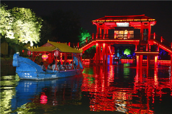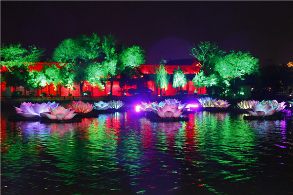 萬荷叢中聞秋聲 “霜落秋聲起汴河,西風(fēng)裊裊白頻波。”小船進入一片荷花叢,驀然荷花綻放,燈光四起,遠(yuǎn)處悠揚的笛韻,岸邊旋轉(zhuǎn)的風(fēng)車,眼前強烈震撼的視覺沖擊,好一派大美風(fēng)光!