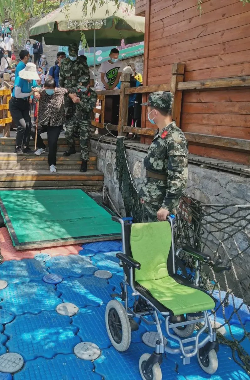 景區(qū)工作人員與執(zhí)勤武警幫助85歲的革命軍人乘船游覽景區(qū)