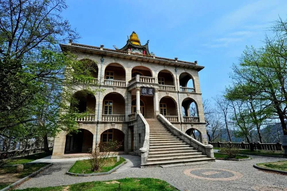 頤廬為直系軍閥吳佩孚部第十四師師長靳云鄂于1921-1923年所建。坐位于洋商區(qū)與教會區(qū)交界處,坐落在南、北街之間靳山的懸崖上,與報曉峰南北對峙,是雞公山最有特色、首屈一指的建筑,在眾多別墅中,猶如“鶴立雞群”,體現(xiàn)了中國傳統(tǒng)的方正端莊的觀念。