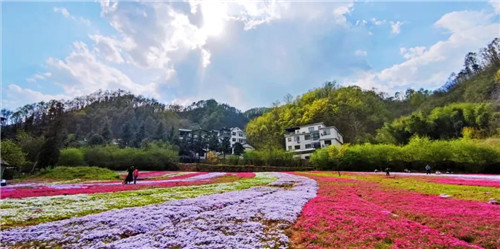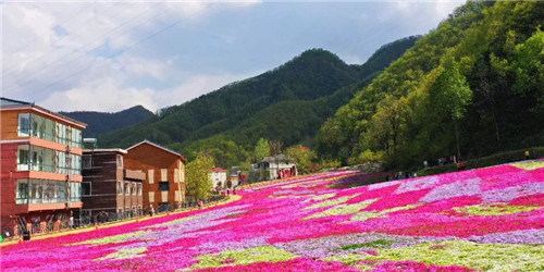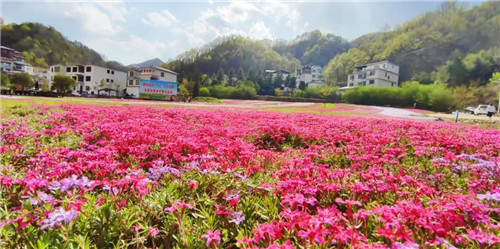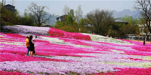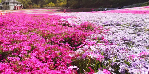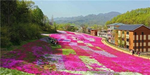 在通往養(yǎng)子溝景區(qū)的沿河公路旁,位于養(yǎng)子溝口村和養(yǎng)子溝村的幾處連片芝櫻花田正在迎風(fēng)盛開,紫色、粉色、紅色、鵝黃的……品種各異的芝櫻花,盡顯嬌艷,遠(yuǎn)遠(yuǎn)望去像是鋪上了最浪漫的彩色地毯。