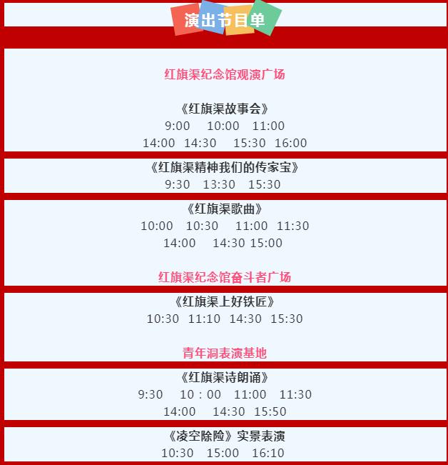 全天演出,精彩不斷!實(shí)景演出、紅旗渠故事會(huì)、紅旗渠歌曲聯(lián)唱、詩(shī)朗誦、《紅旗渠上的好鐵匠》演出,帶您感悟紅旗渠精神。