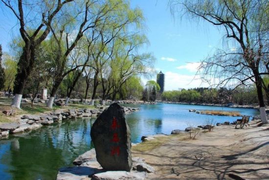近春園:近春園,水域?qū)掗,遍植荷花。朱自清在《荷塘月色》中曾描述過這片清幽之地。小島中心是一片廣場。四周的樹叢竹影中,散落著孔子塑像、吳晗塑像、荷塘月色亭和晗亭。
