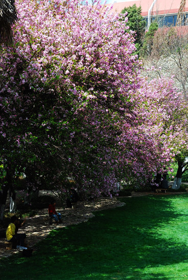 春城,也讓這所大學(xué)有著別的大學(xué)沒有的風(fēng)景。無論何時(shí),校園里總是彌漫著花香,不同時(shí)節(jié),總是有奇異的花朵或植物冒出來。走在古老的建筑邊,問著花香,聽著鳥語,在云大,學(xué)習(xí)和生活充滿詩情畫意。