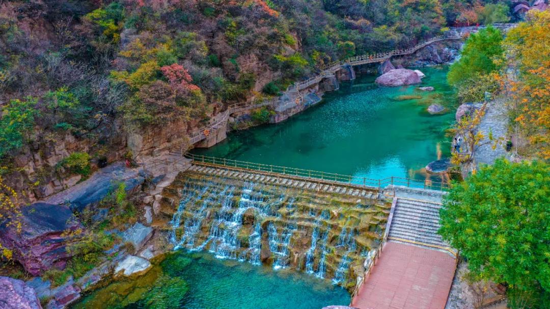 寶泉以水為名,碧水連連,一步一潭,潭潭相扣,山不轉(zhuǎn)水轉(zhuǎn),水不轉(zhuǎn)山轉(zhuǎn),碧水丹山,勾勒出一幅天地間的最美畫卷。景區(qū)水源充沛,山體層巒疊嶂,十分容易形成太行冰掛這種冬季特有的罕見美景。低溫使冰瀑與碧潭凝固,泉靈水盈之地少了水花飛濺的躁動(dòng),卻營造出了瓊樓玉宇的仙境。