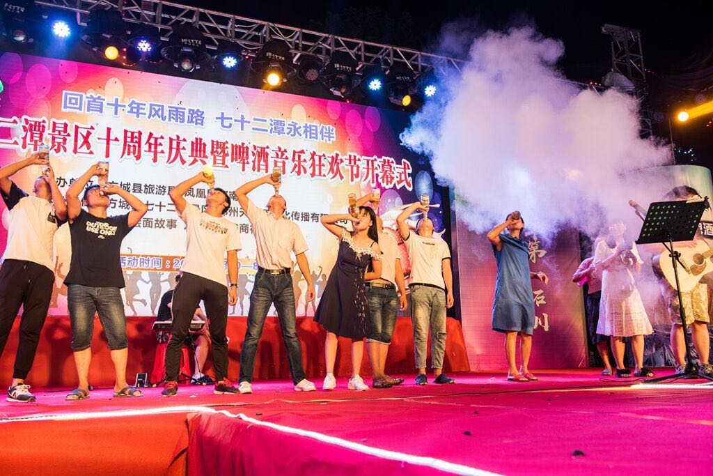 當(dāng)天晚上,首期主題活動(dòng)“七十二潭啤酒音樂狂歡節(jié)”在景區(qū)廣場震撼上演。著名歌星王斐、徘徊樂隊(duì)、維密秀、鋼管舞、爵士舞,各種節(jié)目精彩紛呈!草根明星煤球哥李新義也來到現(xiàn)場,和游客一起斗酒、飆歌、擼串、狂歡!