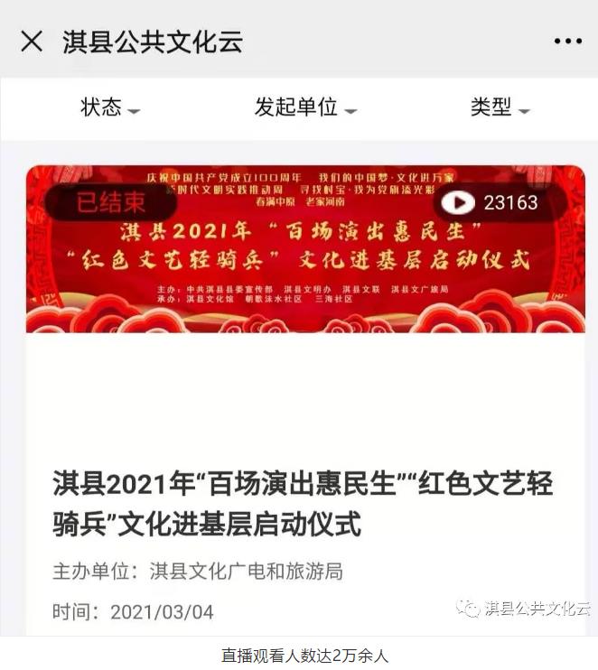 2021年,淇縣將“百場(chǎng)演出惠民生”活動(dòng)列入政府民生實(shí)事,將通過“紅色文藝輕騎兵”深入農(nóng)村田間地頭,開展100場(chǎng)惠民演出,傳遞黨的聲音和關(guān)懷,讓廣大群眾切實(shí)感受到幸福感和獲得感。于此同時(shí),2021年文化志愿服務(wù)鄉(xiāng)村行“尋找村寶”活動(dòng)也同步啟動(dòng),文化志愿者將深入基層,指導(dǎo)村寶開展豐富多彩的群眾文化活動(dòng),助力鄉(xiāng)村文化振興,奮力譜寫高質(zhì)量富美朝歌更加出彩絢麗新篇章。