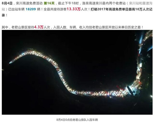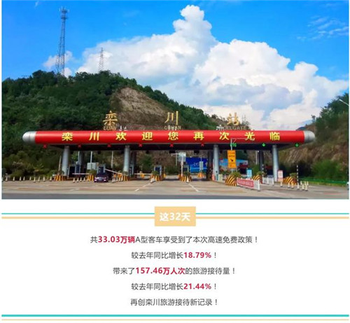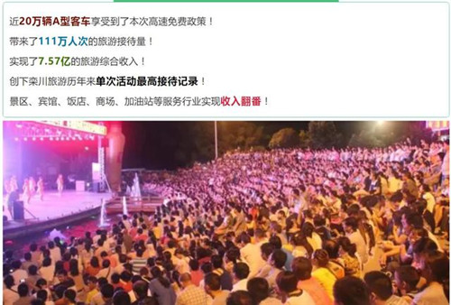2017年欒川縣第一屆高速免費(fèi)活動,短短20天時間,共接待游客111萬人次,自駕游車輛20萬輛,實(shí)現(xiàn)旅游綜合收入7.57億元;