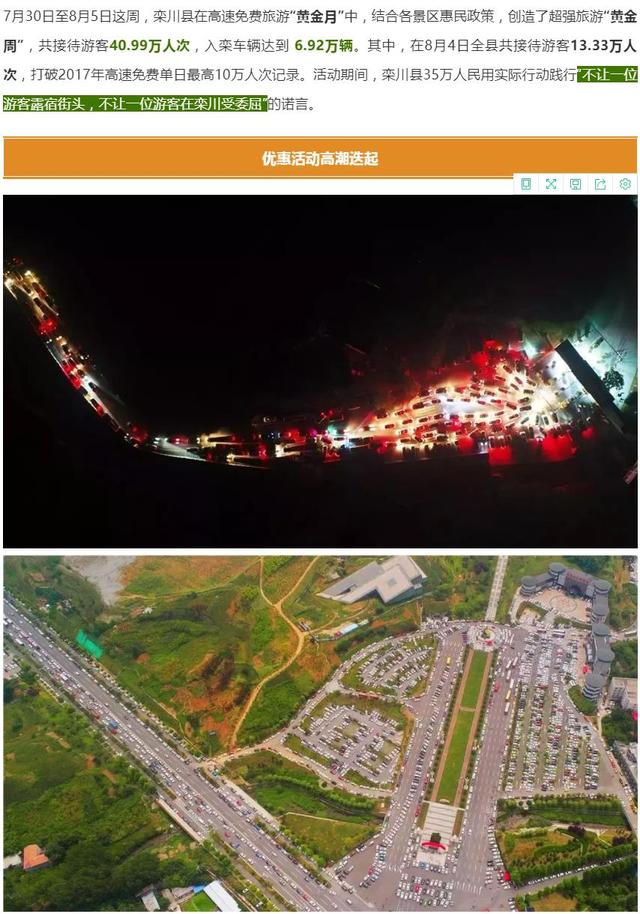 2018年7月30日至8月5日,在高速免費(fèi)的同時,欒川縣八個4A級以上景區(qū)在一周內(nèi)輪番推出住宿半價和免門票的優(yōu)惠政策,免費(fèi)時間不同,讓每個景區(qū)都有機(jī)會成為聚焦點(diǎn),每天都有一個景區(qū)免門票,大大激發(fā)了游客游覽熱情,在高速免費(fèi)旅游“黃金月”中,創(chuàng)造了一個超強(qiáng)旅游“黃金周”,一周接待游客40.99萬人次,刷新了欒川歷史接待紀(jì)錄。