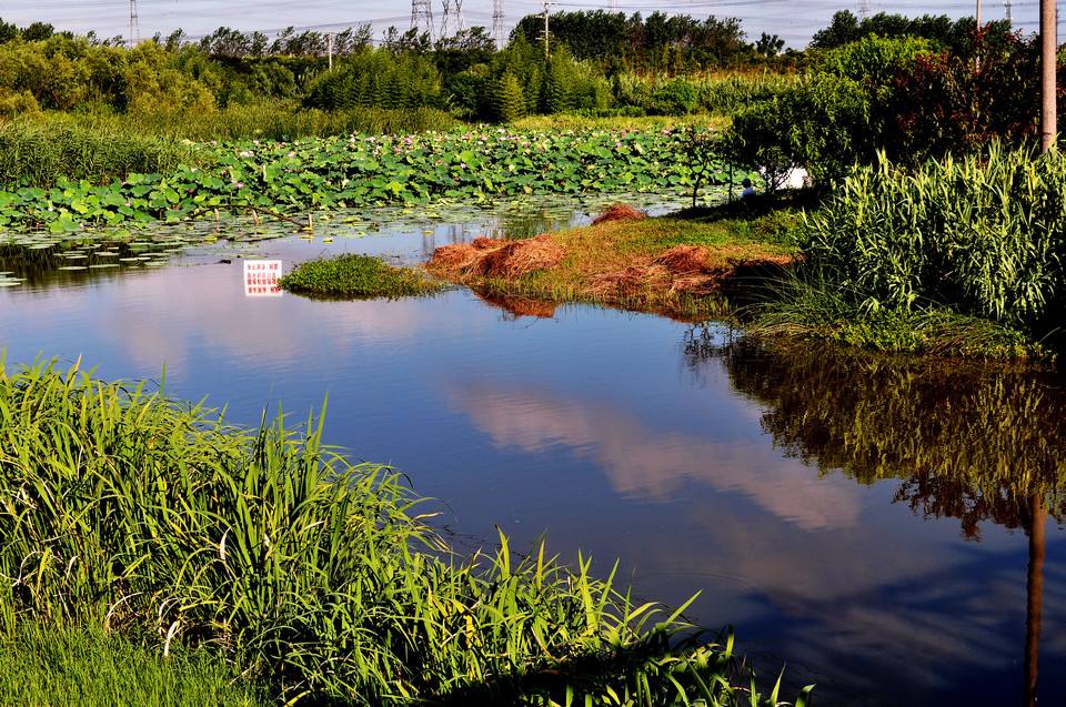 園區(qū)的湖水,有兩個來源,一則引黃河水南下,二則引山體雨水匯流。將來,北園和南園的三個湖泊將相互連通,綠博大道在湖泊連通處隆起呈拱形,舟船可以從下方通過。園方將在湖泊內(nèi)栽植睡蓮、蘆葦?shù)人参铮瑢⒑创蛟斐扇斯竦。水生植物不僅可以凈化過濾水體,還能增添湖面的景觀效果,在夏天是“蓮葉何田田”的景觀,在冬天則是“蒹葭蒼蒼,白露為霜”的效果。
