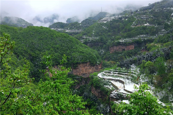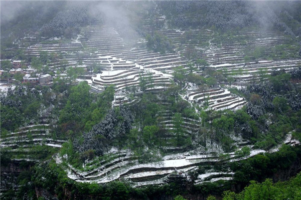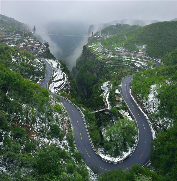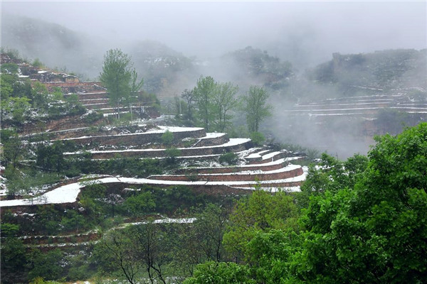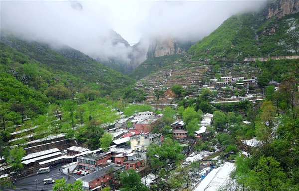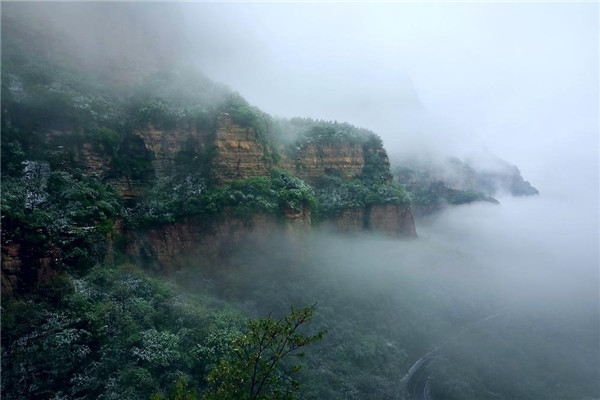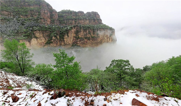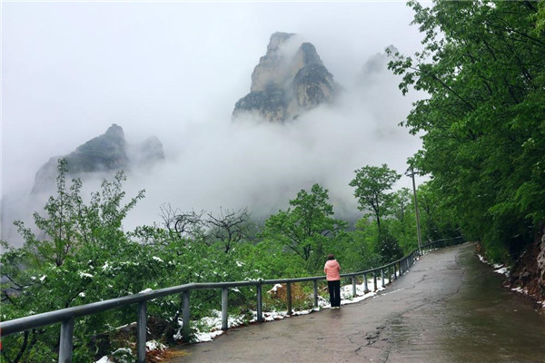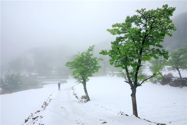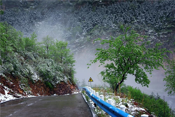 4月的林州,山下一場雨,山上一場雪,靜謐的太行山瞬間變成一幅美輪美奐的水墨畫卷。置身在群山峻嶺之中,環(huán)顧山間、懸崖邊,滿眼是春,處處是景,在綠與白的水墨世界里,絢爛多姿,銀裝素裹間孕育著勃勃生機,獨自靜聽山間雪片簌簌而下,四周萬籟俱寂,心靈無比寧靜,令人格外流連忘返。