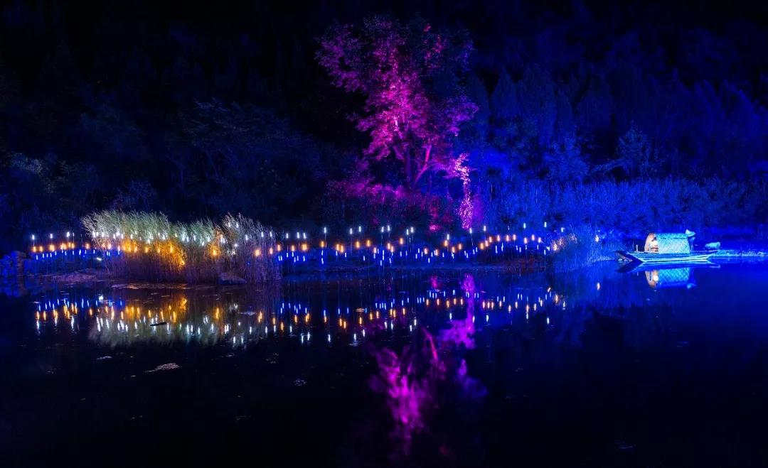 伴著音樂搖曳的竹林草木,波光粼粼的水面閃爍著七彩的光,裝飾著云臺山夜晚曼妙的身姿。