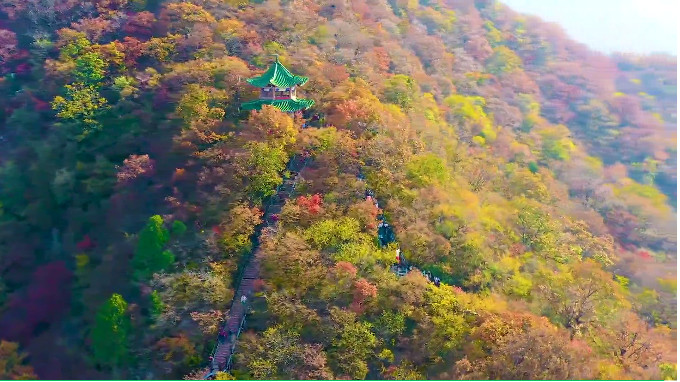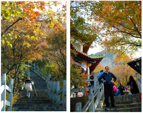 暫別塵事繁囂,攀登千級云梯,遠(yuǎn)山,層林盡染,片片紅葉醉滿山間,時間是初冬,但秋的色彩還在時空里渲染,身處自然之中,負(fù)氧離子爆棚。