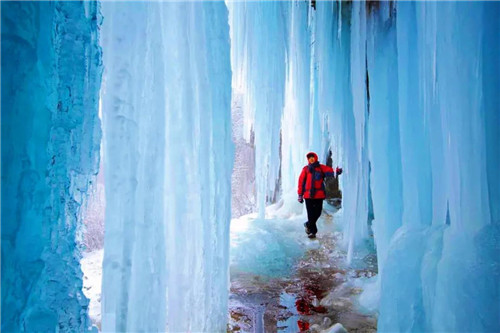 進(jìn)入冬季后,飛瀑結(jié)成了冰瀑、冰川、冰柱、冰筍……在湛藍(lán)的天空下煞是惹眼,陽(yáng)光經(jīng)過(guò)折射煥發(fā)出五彩光束,顯現(xiàn)著獨(dú)特的魅力。