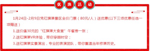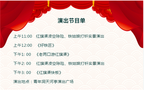 1月25日(大年初一)——1月30日(正月初六)推出紅旗渠特色演出,《好鐵匠》、過年秧歌、民俗快板、歡慶鑼鼓、實(shí)景演出等多項(xiàng)極具傳統(tǒng)特色的節(jié)目,讓廣大游客在欣賞紅旗渠美景的同時,感受到民俗文化的獨(dú)特藝術(shù)魅力。
