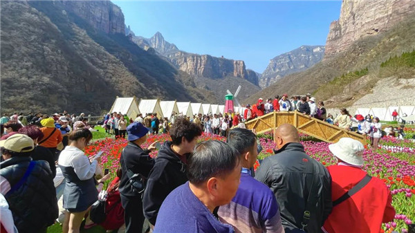 你要寫寶泉的花海,就不能只寫花海,你要寫"太行春天是從這里開始",寫超百萬株的郁金香花,組成了這大峽谷中的"彩虹地毯",寫花與影,寫藍天與白云,寫春風,寫花香,寫游人賞花,寫風與花瓣的輕柔。