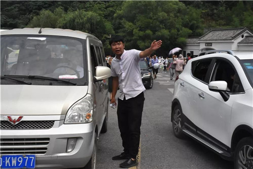 “您好,開車沿這條道路直行,到云景索道停車場(chǎng)后,步行100米,即可到達(dá)索道站”。8月4日,景區(qū)平陽廣場(chǎng),工作人員正在解答游客咨詢。