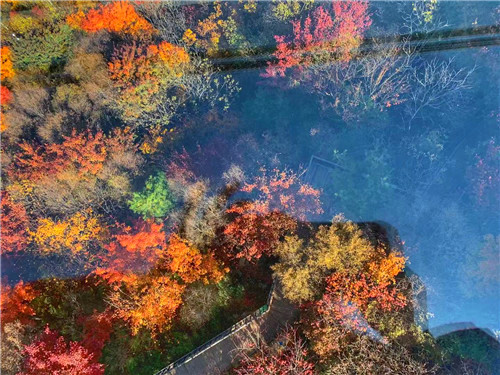 坐纜車?yán)锟醇t葉。在老界嶺,有一條長(zhǎng)1063米,高480米的觀光索道,置身纜車之中,遠(yuǎn)處是連綿的山脈,腳下是五彩的世界,你猶如手執(zhí)彩色畫筆的創(chuàng)作者,每一處都是你的作品,而你正在審視自己的每一筆杰作,想想都是無比曼妙的體驗(yàn)。如果恰巧遇到霧天,坐上纜車穿越過云霧繚繞的山脈,紅葉在云海中忽隱忽現(xiàn),如同在仙境中穿梭,神秘又奇妙的感覺一定讓你念念不忘!