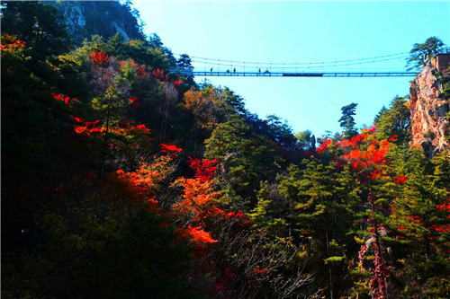 在吊橋上看紅葉。老界嶺高空玻璃吊橋建于老界嶺風(fēng)景區(qū)神女峰旁,全長(zhǎng)達(dá)120米,離地高度超百米,是凌駕于峰頂之上的玻璃吊橋。這里不僅是考驗(yàn)?zāi)懥康牡胤,更是金秋時(shí)節(jié)不可錯(cuò)過的賞紅地,于群山之上,紅海之中,抬起頭,深深的吸一口氣,秋天的味道縈繞鼻尖,是成熟的,是喜悅的,更是熱烈的。而你,完完全全的“淹沒”在這片紅色的海洋里,這種極致體驗(yàn)盡在金秋時(shí)節(jié)的老界嶺!