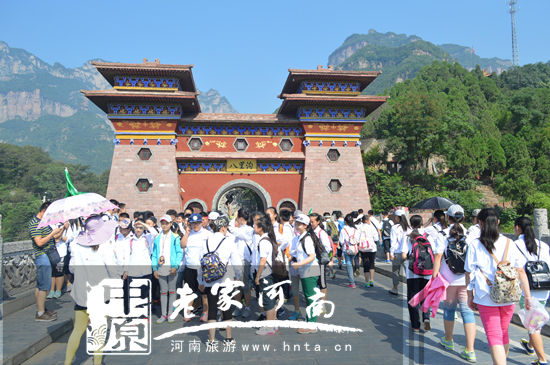學(xué)生們剛走進(jìn)八里溝景區(qū)山門,就被古色古香“漢唐式”建筑風(fēng)格的雙重山門所吸引,他們紛紛在八里溝山門前合影留念。