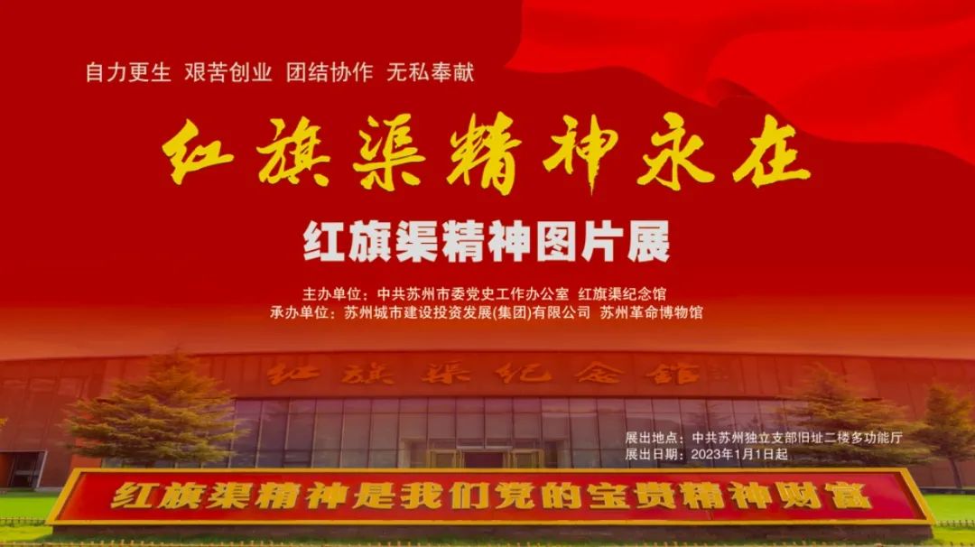 “紅旗渠精神永在”紅旗渠精神圖片展由中共蘇州市委黨史工作辦公室、紅旗渠紀(jì)念館主辦,蘇州城市建設(shè)投資發(fā)展(集團(tuán))有限公司、蘇州革命博物館承辦,展覽地點(diǎn):姑蘇區(qū)體育場(chǎng)路4號(hào),中共蘇州獨(dú)立支部舊址二樓多功能廳。