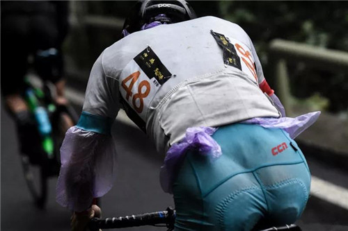 天路征途遇上雨戰(zhàn),選手把雨衣穿在騎行服里面試圖隔水和保暖
