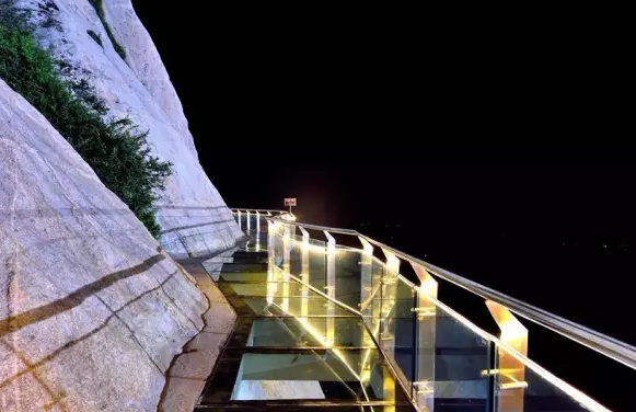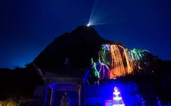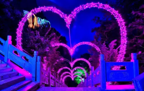 這燈,山下智亭景區(qū)也有,但是山頂更炫。繞著新修的玻璃棧道,五彩的燈光形成一條光帶。各種造型的燈飾,有平面造型的少女、奔馬、鉆石、瀑布、寶塔,各種燈籠,樹上的光帶,還有3D的金色帆船,航行在蔚藍的海上,走著看著讓人眼前一亮的,是山巖上一對“小鹿”,一頭在俯頭吃草,一頭在溫柔地張望。