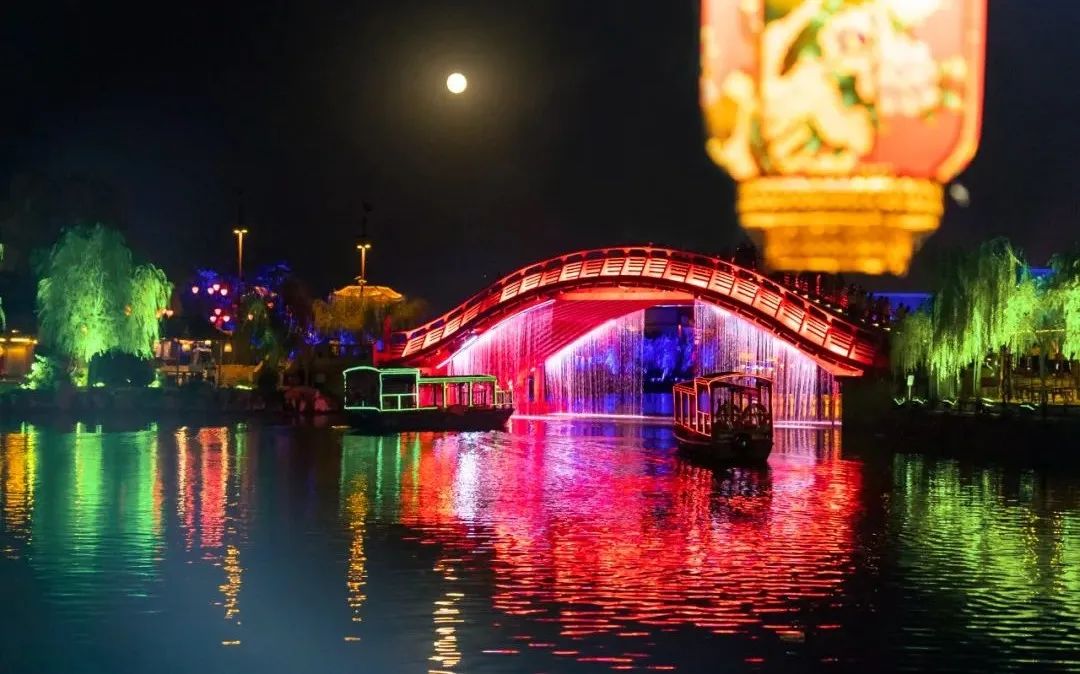 滿園五彩繽紛的燈籠,懸掛在熱鬧商鋪,點綴在水榭橋梁,還有超大月亮“降落”在你身邊,北宋時期的市井之繁華莫過于此!