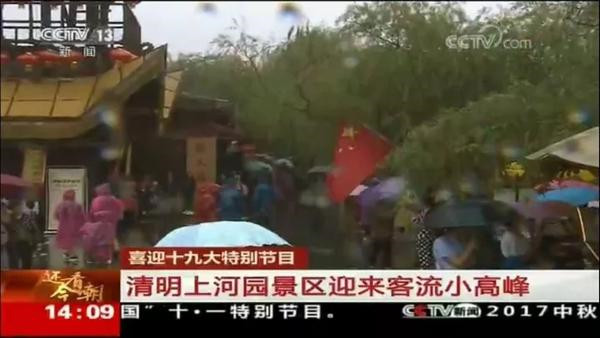 10月1日下午14:00時(shí),中央電視臺(tái)推出的喜迎十九大特別節(jié)目《還看今朝•河南篇》在中央電視臺(tái)新聞?lì)l道、央視新聞客戶端、央視移動(dòng)新聞網(wǎng)、河南衛(wèi)視進(jìn)行了同步直播。節(jié)目中,對(duì)清明上河園景區(qū)國(guó)慶節(jié)當(dāng)天的游園狀況進(jìn)行了現(xiàn)場(chǎng)報(bào)道。