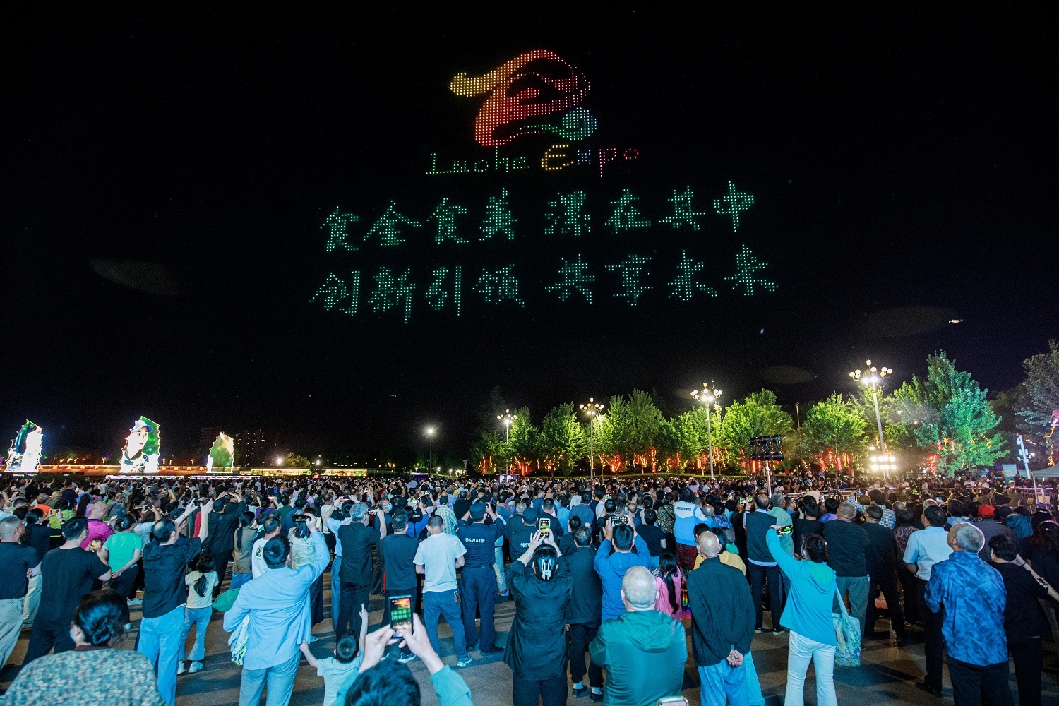晚上8點(diǎn),約2000架無(wú)人機(jī)閃耀著光芒在沙澧河交匯處騰空而起,以流動(dòng)的圖形和絢麗的畫面點(diǎn)亮了夜空,展示了“賈湖遺址”“字圣許慎”等豐富多彩的漯河文化元素、地標(biāo)建筑、知名食品企業(yè)和本屆食博會(huì)會(huì)標(biāo)及“食全食美、漯在其中、創(chuàng)新引領(lǐng)、共享未來(lái)”主題,為食博會(huì)加油喝彩。精彩的表演令游客驚嘆不已。