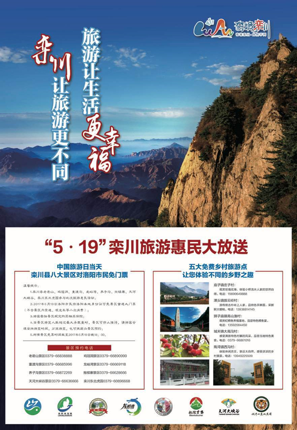 今年5月19日是第七個“中國旅游日”,欒川縣八大景區(qū)對洛陽市民免門票。欒川縣老君山、雞冠洞、重渡溝、龍峪灣、養(yǎng)子溝、抱犢寨、天河大峽谷、欒川東北虎園參與此次旅游惠民活動。洛陽市民持洛陽本地身份證可免景區(qū)首道大門票(不含景區(qū)內(nèi)索道、觀光車等二次消費),進入景區(qū)的游客需按景區(qū)規(guī)定購買相關(guān)保險。景區(qū)免票時間截至19日下午18點整。當景區(qū)游覽人數(shù)超過最大承載量時,景區(qū)可以停止接待。有意前往景區(qū)的市民要合理安排游覽時間,也可提前向景區(qū)預(yù)約。