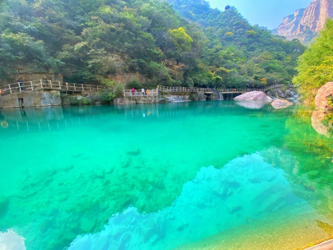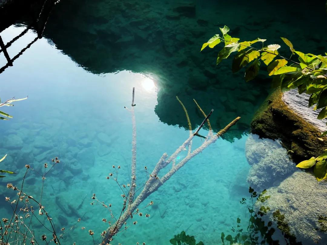 翡翠海流水潺潺,似一塊藍(lán)寶石,妝點(diǎn)著這方秘境,湖水透徹,映襯的秋日山峰,有洗滌心靈的魔力~