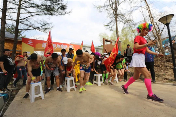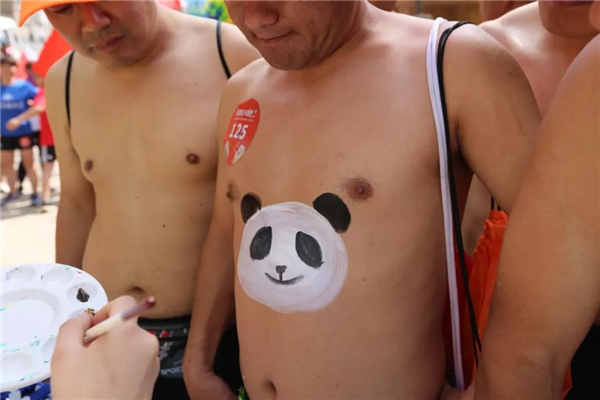 活動開始時,各地選手按要求就位,進入換裝區(qū)換裝備戰(zhàn)。男選手光著上身,只穿一件短褲,裸露的身體畫有大熊貓、小豬等各種卡通彩繪,頭戴五顏六色的假發(fā)套,讓人忍俊不禁;美女選手盡顯曼妙身材魅力。比賽現(xiàn)場,吸引了萬余名游客參與觀戰(zhàn),氣氛熱烈。