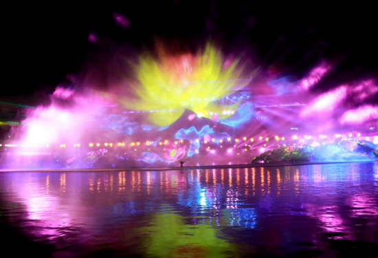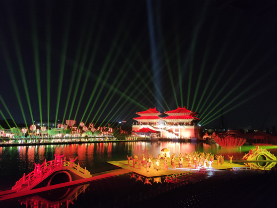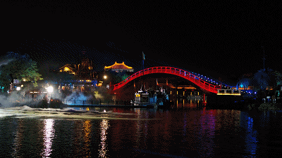 夜幕降臨,光影起舞,倒映水中,搖曳生姿,空中星光點點,水里光影變幻,眼前的荷花全息投影更是炫彩之極,流不盡的汴水悠悠,品不盡的大宋風情。