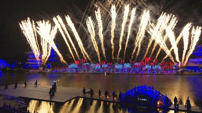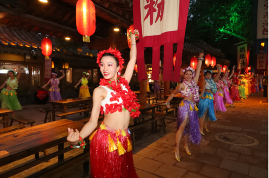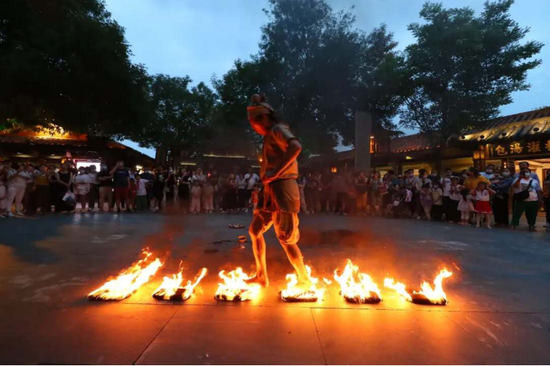 當手舞足蹈、歡樂蹦跳的大宋子民從人群中突然出現(xiàn),與游客們一同狂歡、舞蹈,鬧至通宵,恍然間,好像真的回到了千年前的大宋盛世東京城。