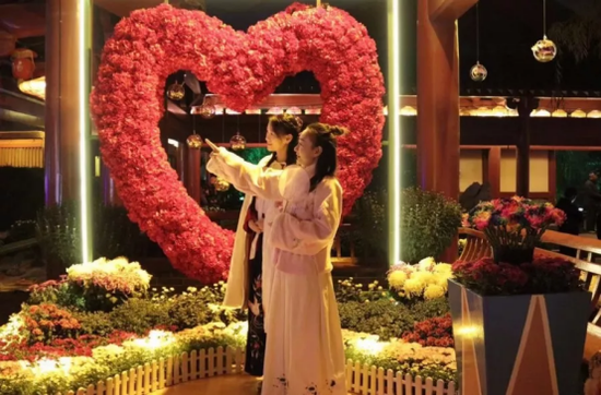 特別是在菊花文化節(jié)期間,數(shù)十位菊花仙子和盛開的菊花相互映襯,給夜間增添了一絲神秘的魅力。